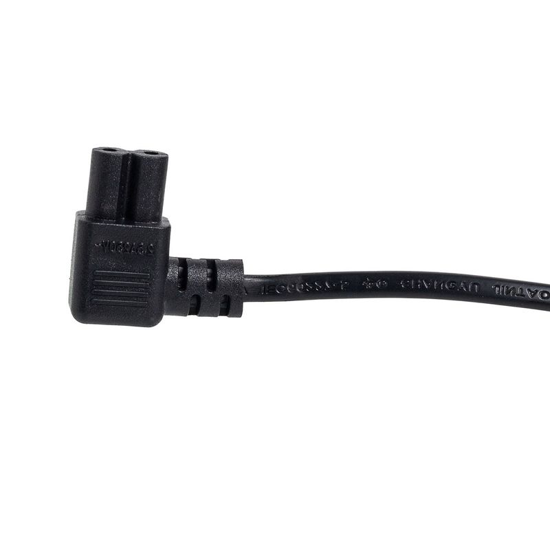 O Cabo de Força Bipolar Tipo 8 - 90º graus de 10A. A angulação facilita o manuseio em locais estreitos. O cabo serve para conectar equipamentos eletrônicos na rede elétrica.